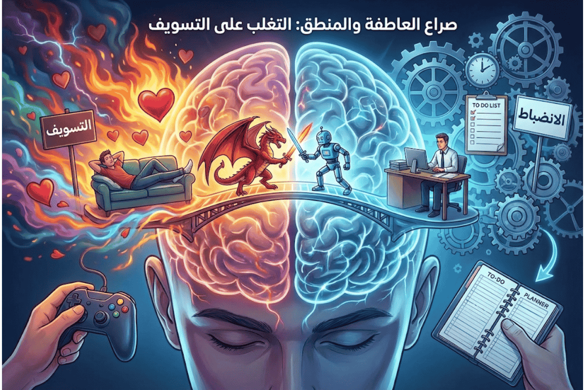 لفهم سيكولوجية “التسويف” ولماذا نؤجل المذاكرة، يجب أن ننظر إلى ما يحدث داخل الجمجمة. هناك معركة مستمرة بين جزأين في الدماغ: